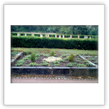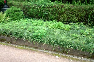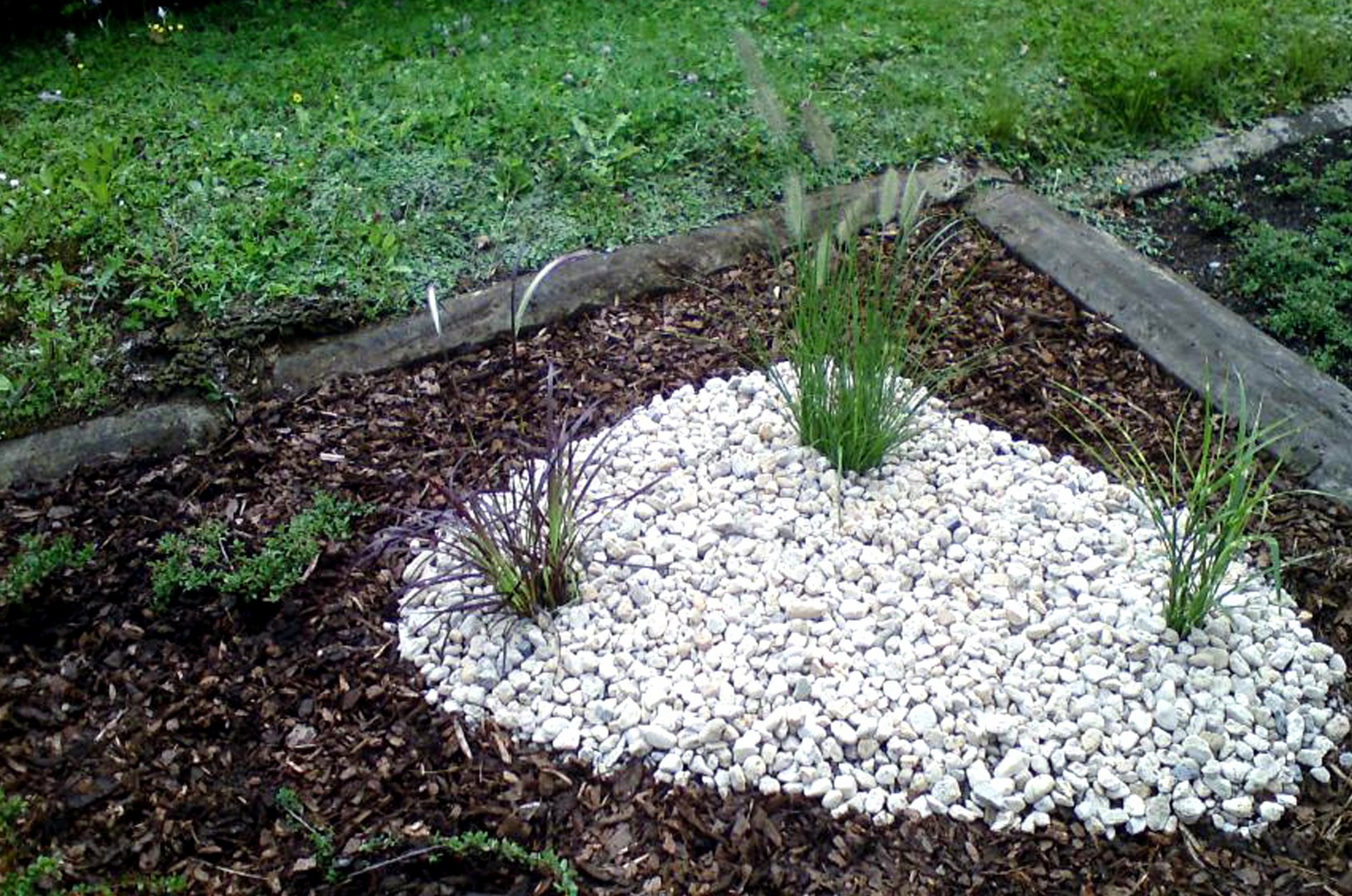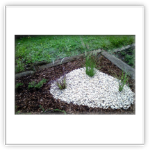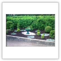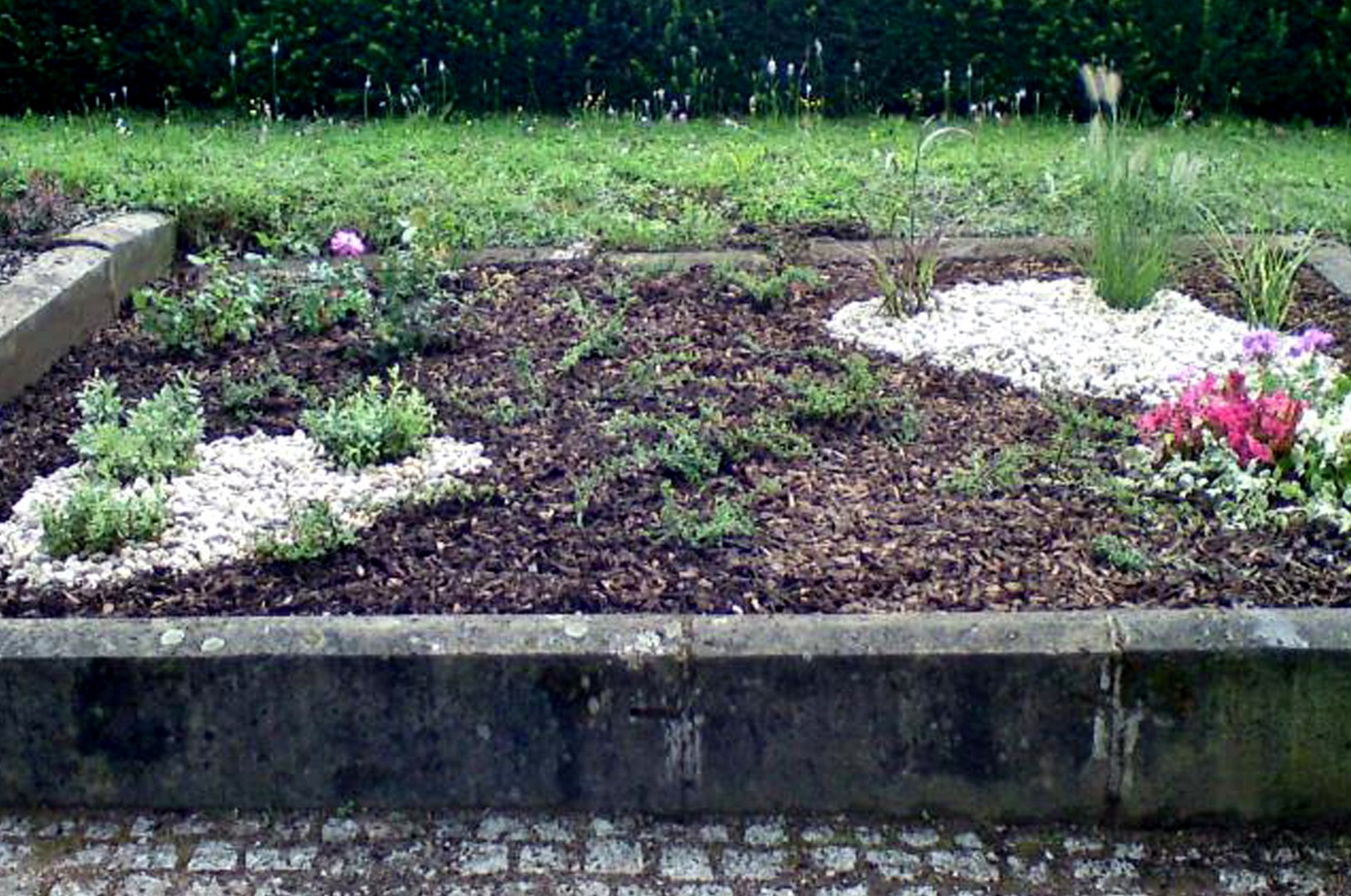 Danach legten wir neue Kiesflächen an mit eingelassenen Sandsteinplatten und einer Umrandung mit Tuffsteinen, Fleckenbepflanzung mit Eisblumen mit blaugrauer Kießabdeckung. Wir trugen Rindenmulch zur Eindämmung von Unkrautwuchs und zur Verhinderung von zu starker Austrocknung auf und stellten eine bepflanzte Sommerschale mit Sockel.